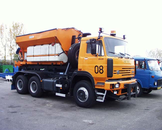 Jednoramenný nosič kontejnerů LIAZ CTS 14049 s kontejnerovým sypačem komunikací SCHMIDT